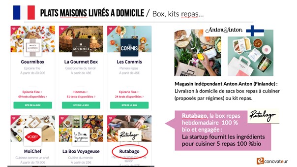 La grande nouveauté alimentaire reste cependant la venue des box repas. Celles-ci réunissent tous les ingrédients nécessaires au juste dosage (viande ou poisson crus, légumes et condiments.) avec des fiches recettes pour cuisiner pour la semaine ou plusieurs jours en général. Citons Rutabago, dédiée aux repas bio. Leur croissance encore jeune est cependant dopée durablement par le Covid.