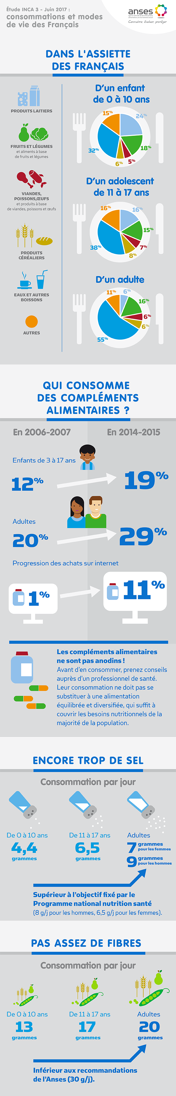 L’assiette des Français contient une grande part d’aliments transformés et encore un peu trop de sel (en moyenne 9 g/j chez les hommes et 7 g/j chez les femmes à comparer aux objectifs du Programme national nutrition santé de respectivement 8 g/j et 6,5 g/j). Les apports en fibres (20 g/j en moyenne chez les adultes) apparaissent quant à eux trop faibles par rapport aux recommandations de l’Anses (30 g/j). Les Français consomment de plus en plus de compléments alimentaires. En outre, beaucoup d’aliments sont issus de leur propre production (eau y compris, via des puits privés) ou de celle de proches.