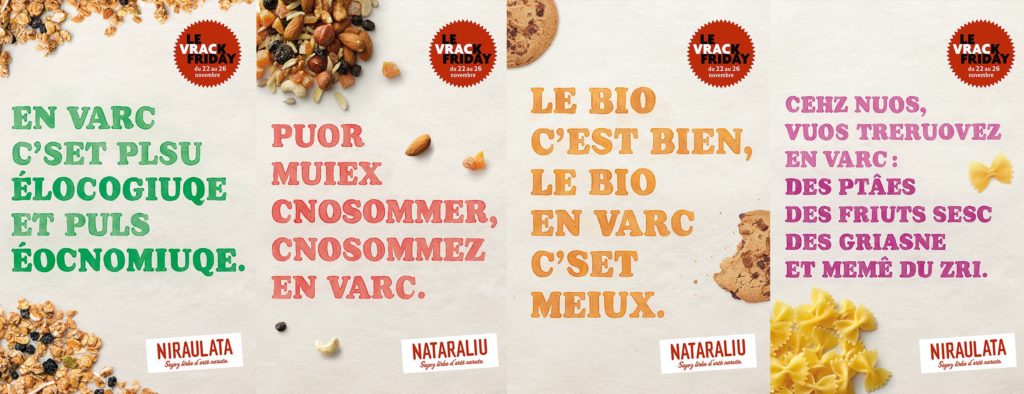 Allon Zeitoun: Le principe du Vrack Friday était de détourner le BLACK FRIDAY pour inviter les clients à consommer de façon plus durable particulièrement en cette période où on peut vite se laisser aller à une consommation excessive. Pour que le message soit fort, il fallait réussir à croiser les codes du vrac et du Black Friday. Le « naming » de l’opération évoquait volontairement le Black Friday et les créations mettaient toutes les textes en vrac jusqu’au logo pour valoriser ce rayon.