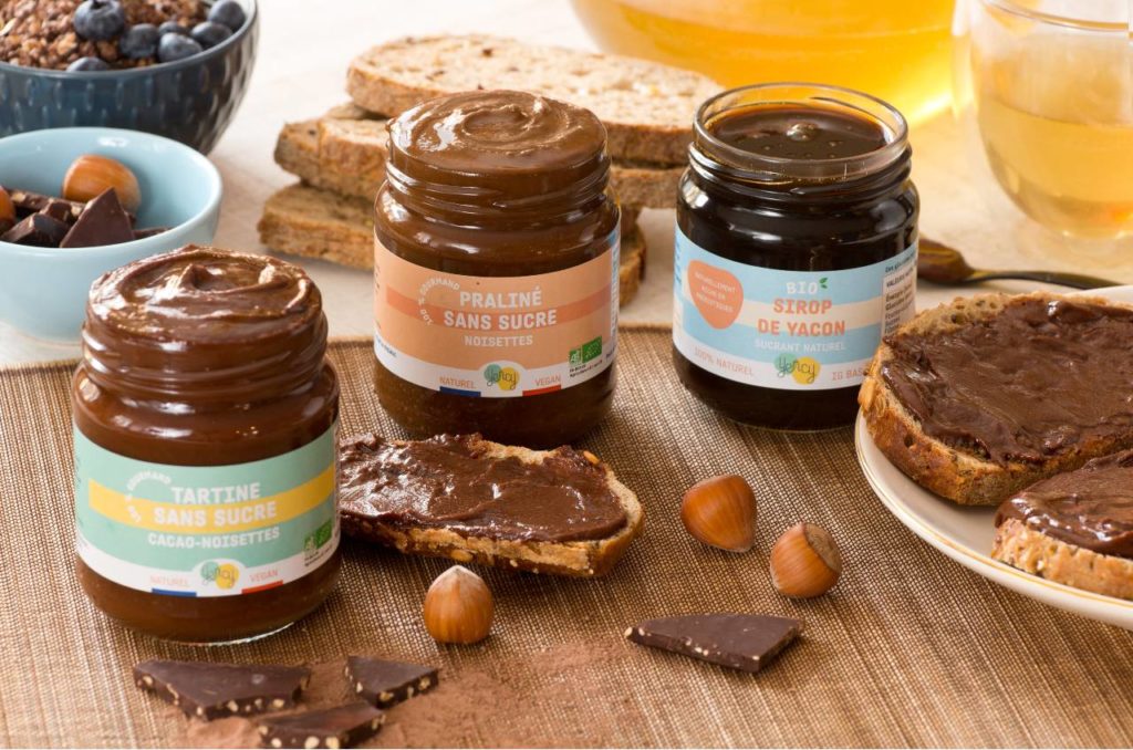 CP : Ce qui nous intéresse, c’est le petit-déjeuner. Pourquoi ? Parce que l’OMS recommande de consommer 30g de sucre par jour et qu’un consommateur français en consomme 80g dès le petit déjeuner. Cela engendre de lourdes conséquences à long terme sous formes de pathologies, mais aussi à court terme, avec de la fatigue, du stress, de l’anxiété ou de la mauvaise humeur. D’où l’idée d’une gamme qui alimente un petit déjeuner sans sucre et gourmand. Nous avons le sirop de Yacon, notre cœur de gamme, qui est un sucrant pour le thé, le café, les yaourts ou les gâteaux, et aussi des pâtes à tartiner : pralinée avec 65% de noisettes, chocolat avec du cacao cru. Nous avons, en outre, deux nouveaux produits en projet : une pâte chocolat au lait et un praliné noisette-amande ou cajou.