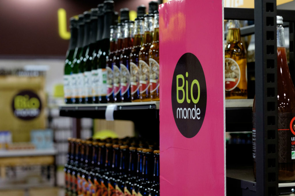Linéaire vins et bières bio au sein d’un magasin Biomonde (Crédit photo Biomonde)