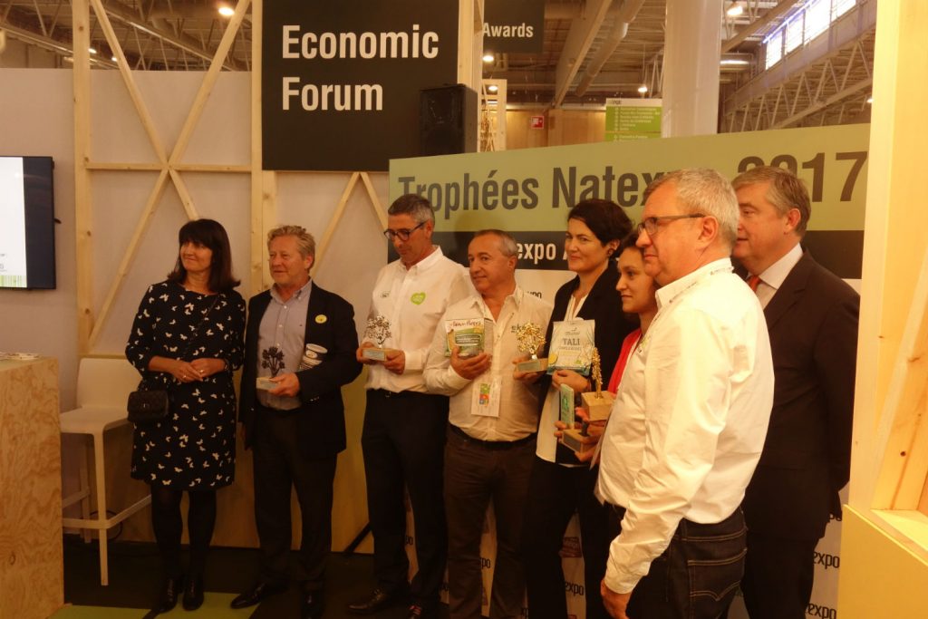 « Une entreprise agroalimentaire bio sur deux a lancé un nouveau produit en 2014 et en 2015 » précise Hélène Timoshkin économiste au sein du cabinet Asterès. Un chiffre qui signe le dynamisme du marché, rejoint par de multiples jeunes pousses. Cette année encore, le salon récompensait les innovations par la remise de « trophées Natexpo », classés par secteurs (alimentation, cosmétique, services à la personne, compléments alimentaires). Cette année, quatre entreprises ont reçu un trophée d’or : Marinoë, une société bretonne spécialisée dans les algues alimentaires pour ses chips d’algues séchées à l’air Tali ; la marque Namaki Cosmetics pour son Mascara Cheveux labellisé Cosmos Organic, le sachet de lessive Terra Wash+Mg constitué de 99,95% de magnesium pur de la société japonaise MK Enterprise Inc et la marque le Pain des fleurs (société Ekibio) pour ses tartines craquantes aux lentilles vertes et riz de Camargue: «Ce trophée va nous permettre de mettre notre produit en avant et d’avoir un bon linéaire en magasin », se réjouit Didier Perréol, PDG du groupe Ekibio qui a accueilli auparavant Stéphane Travert sur son stand.
