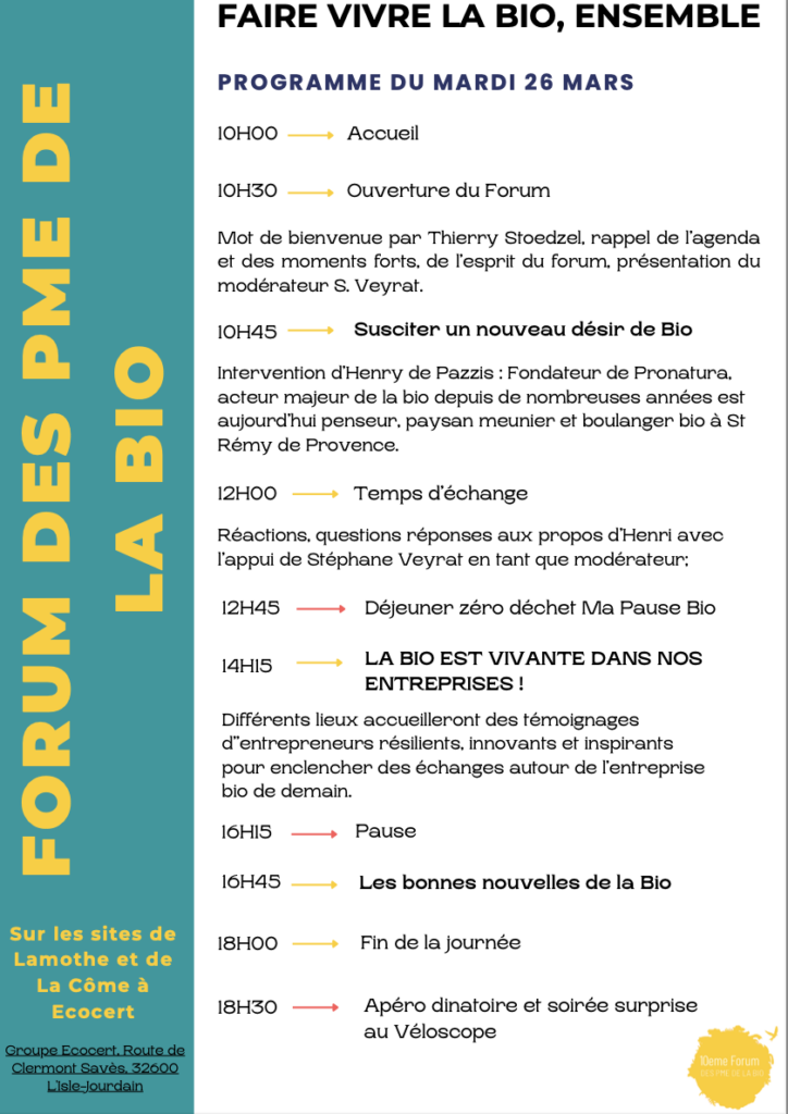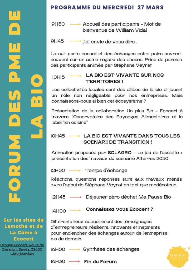 Cette année, Ecocert aura le plaisir d’accueillir le 10ème Forum des PME de la Bio qui se déroulera les 26 & 27 mars 2024 dans les locaux Ecocert de l’Isle Jourdain (Gers), situés à 30 min de Toulouse.