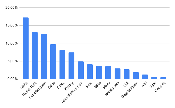 Avec 17,2 % de part de marché de la distribution bio en 2018, le leader est la chaîne discount Netto (plus de 500 magasins), qui appartient à Salling Group (appelé Dansk Supermarked jusqu’en juin 2018). Celui-ci possède également les enseignes Føtex (une centaine de supermarchés) et Bilka (18 hypermarchés), ce qui lui donne une part de marché globale de 29 %. Acteur dynamique du marché bio, pratiquant une politique visant à rendre le bio accessible à tous, avec notamment sa MDD ØG0 (environ 200 références), Netto affiche partout – bannières, sacs et véhicules — son slogan qui signifie en danois « Tout le monde doit avoir les moyens d’acheter bio ». Du côté de Føtex, l’objectif est d’élargir encore plus son offre bio, pour arriver à 2 000 références en cette année 2020 (sa MDD Levevis compte environ 1 300 produits).