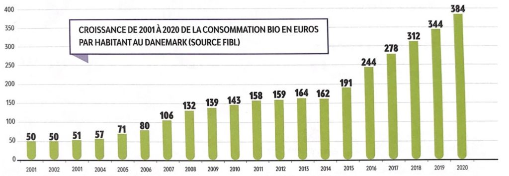 Comme le souligne l’Agence Bio dans sa dernière édition (2021) de son rapport L’agriculture bio dans l’Union européenne, « en 2020, plus de trois quarts des Danois ont acheté des produits bio toutes les semaines (contre 52,5 % en 2019 et 48,7 % en 2016). Le développement avancé du marché bio danois peut être expliqué par les campagnes de sensibilisation qui ont été organisées (le logo bio danois est connu par 98 % des habitants) et par la coopération entre les enseignes de la grande distribution et la fédération bio, Organic Denmark. Cette dernière travaille avec la GMS au niveau stratégique et soutient les enseignes dans le développement de leurs rayons bio afin de donner plus de visibilité aux produits bio. Des formations et séminaires sont organisés pour aider les petites entreprises à travailler avec la GMS et la RHF. »