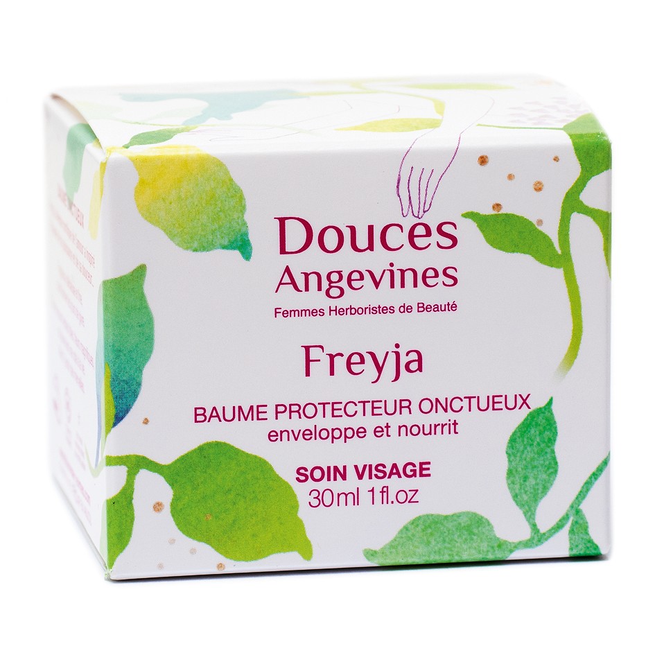 Baume visage fondant, Freyja nourrit intensément, protège des intempéries, calme les rougeurs et illumine le teint. Sa formule végétale aux macérats du jardin veloute la peau.