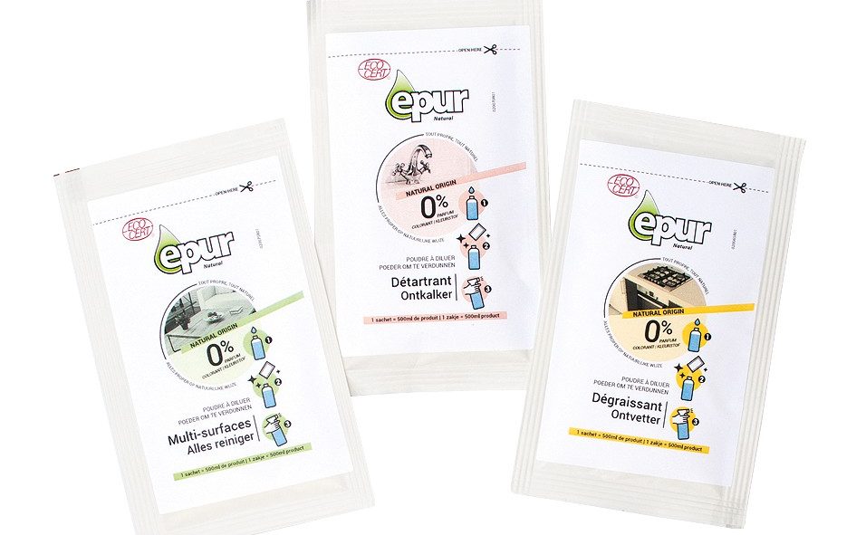 Grâce à la poudre à diluer Epur, pas de transport inutile d’eau, et moins de plastique grâce à l’utilisation d’un flacon rechargeable pour diluer la poudre dans de l’eau.