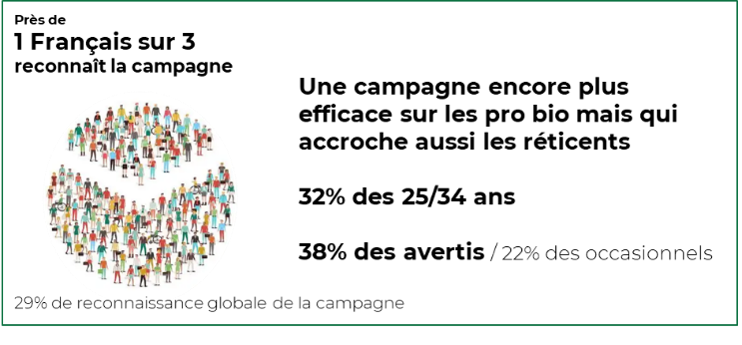 La campagne a été bien comprise par les Français, notamment grâce à une bonne complémentarité des médias : plus de 80% des sondés ont compris les messages clés de la campagne. Bonne perception du message en faveur d’une attitude éco responsable en mangeant bio.