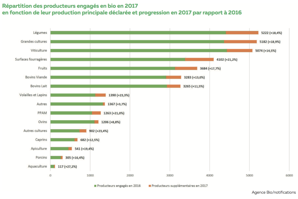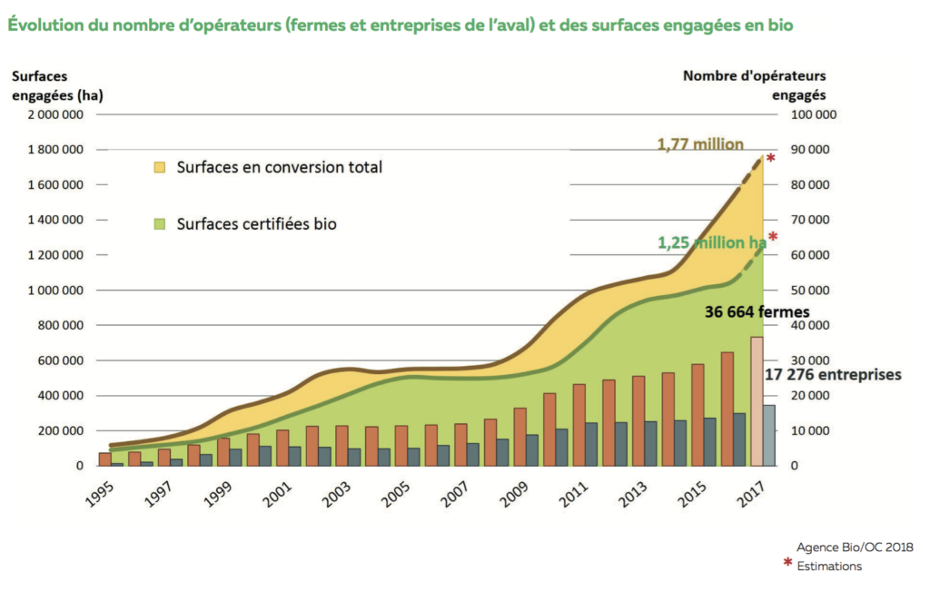 L’importance croissante du secteur bio auprès des pouvoirs publics est légitimée par l’essor et le dynamisme de l’agriculture biologique. On compte 53 940 exploitations agricoles et entreprises engagées dans le bio au 31 décembre 2017, soit une augmentation de 14,5% par rapport à 2016. Les surfaces cultivées selon le mode biologique sont estimées à 1,77 millions d’hectares en 2017 (+ 15% en un an) avec près de 520 000 hectares en conversion.